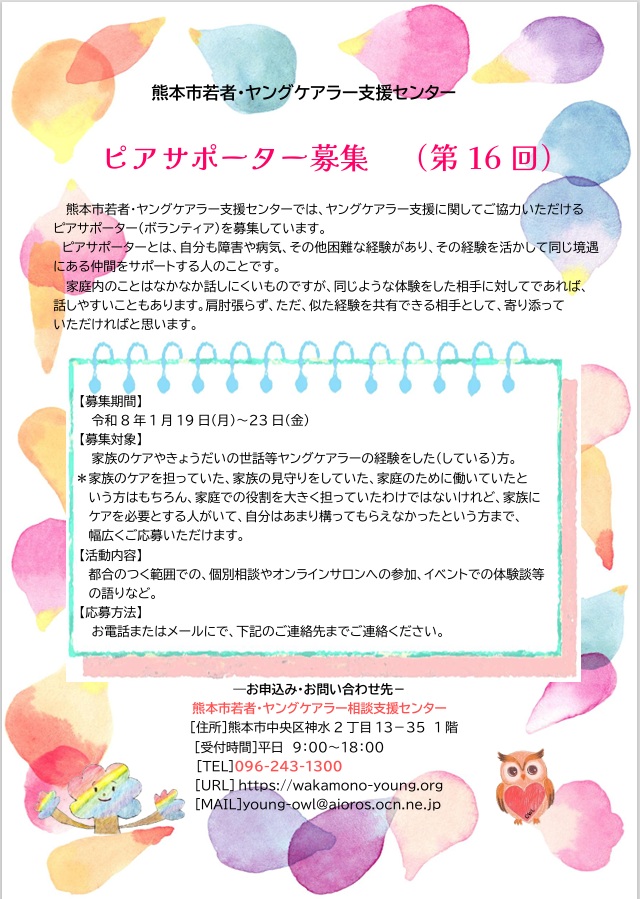 熊本市若者・ヤングケアラー支援センターでは、ヤングケアラー支援に関してご協力いただけるピアサポーター(ボランティア)を募集しています。