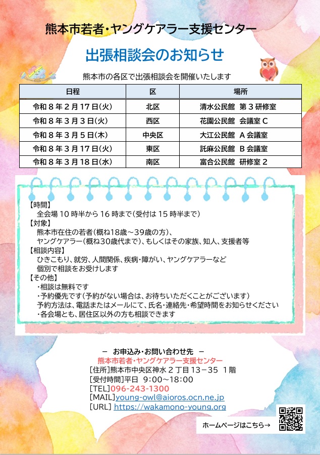 熊本市在住の若者(概ね18歳~39歳の方)、ヤングケアラー(概ね30歳代まで)、もしくはその家族、知人、支援者等